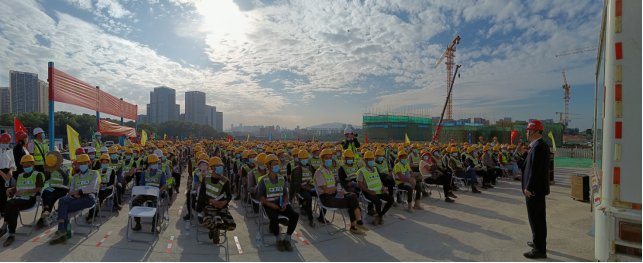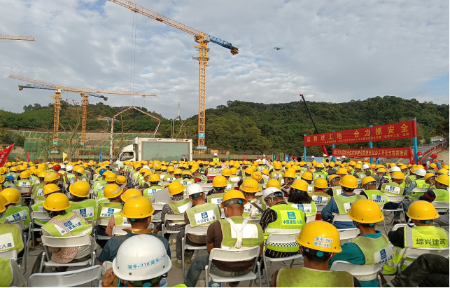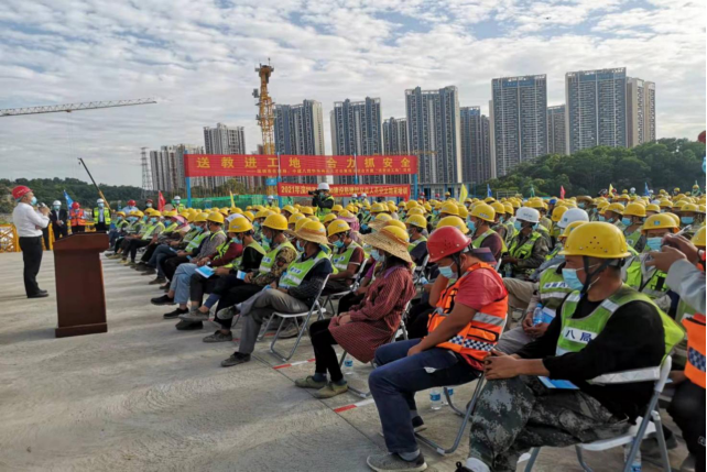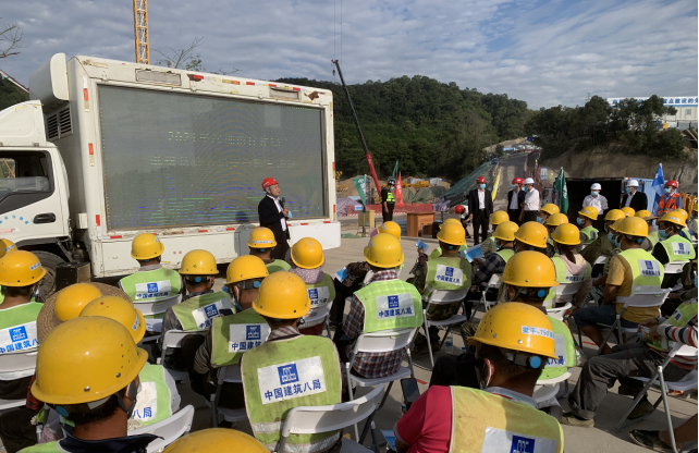 (活动现场全体施工人员有序听讲 中建八局华南分局工程总监钟昉致辞)