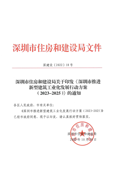 市住房和建设局正式出台《深圳市推进新型建筑工业化发展行动方案(2023-2025》(深建设〔2022〕18号),以下简称《新型建筑工业化行动方案》),通过六大体系24项重点任务,进一步统筹落实现代建筑业高质量发展总体要求,以新型建筑工业化为核心,进一步扩大装配式建筑实施范围,推动装配式建筑规模化发展,深度融合信息化、数字化和智能化技术,全力打造“深圳建造”品牌。