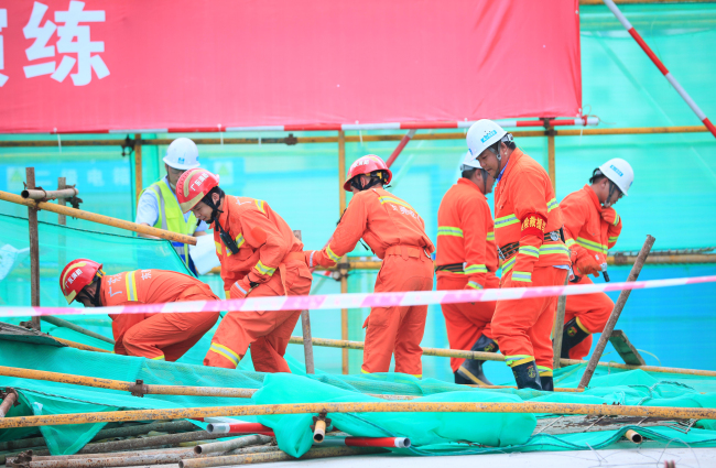 演练中,因外架连墙件大面积被涂料工人拆除,违规作业导致架体整体晃动造成垮塌,3名涂料工人被困架下。安全员谢唐文在巡查中发现意外后立即上报警情,项目随即启动应急预案,并联系119、120请求救援。此时现场作业已全面暂停,人员正紧张有序地被组织疏散、撤离。