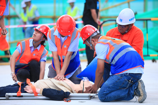 “各小组马上赶往事故现场集合,全面展开救援!”项目经理申伟第一时间赶往现场,并成立临时指挥中心。收到指令后,项目警戒组、技术组、抢险组、医疗组迅速抵达。警戒组携带警戒带、铁护栏等设施对坍塌区域、现场道路和大门进行了封闭,并严禁无关人员进入现场,保持救援道路通畅;技术组根据施工方案、结构图纸对坍塌区域进行详细勘察,发现有二次坍塌危险后迅速出具加固方案,与抢险组协同排除险情;抢险组利用救援器材救出伤员,衔接医疗组展开急救,并随医护人员将伤员扶往医院进一步治疗。现场情况稳定后,消防队和专家组携专业救援设备来到现场将险情完全控制。