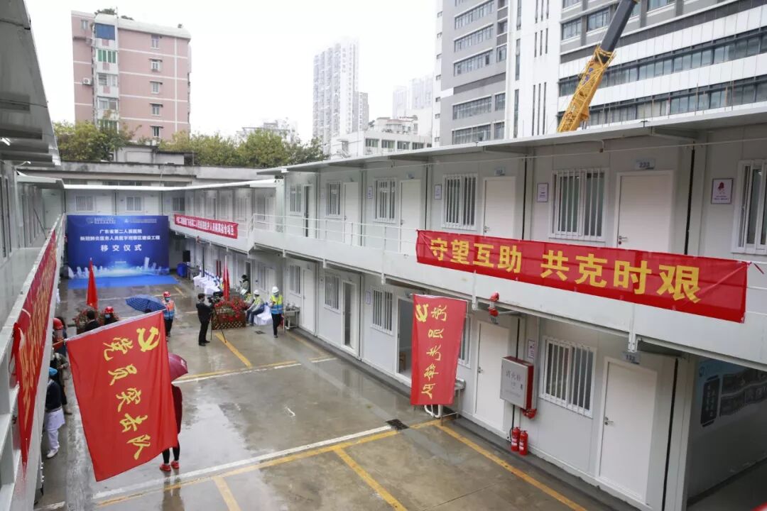 2月13日下午,临建区集装箱医学观察宿舍全部完工。