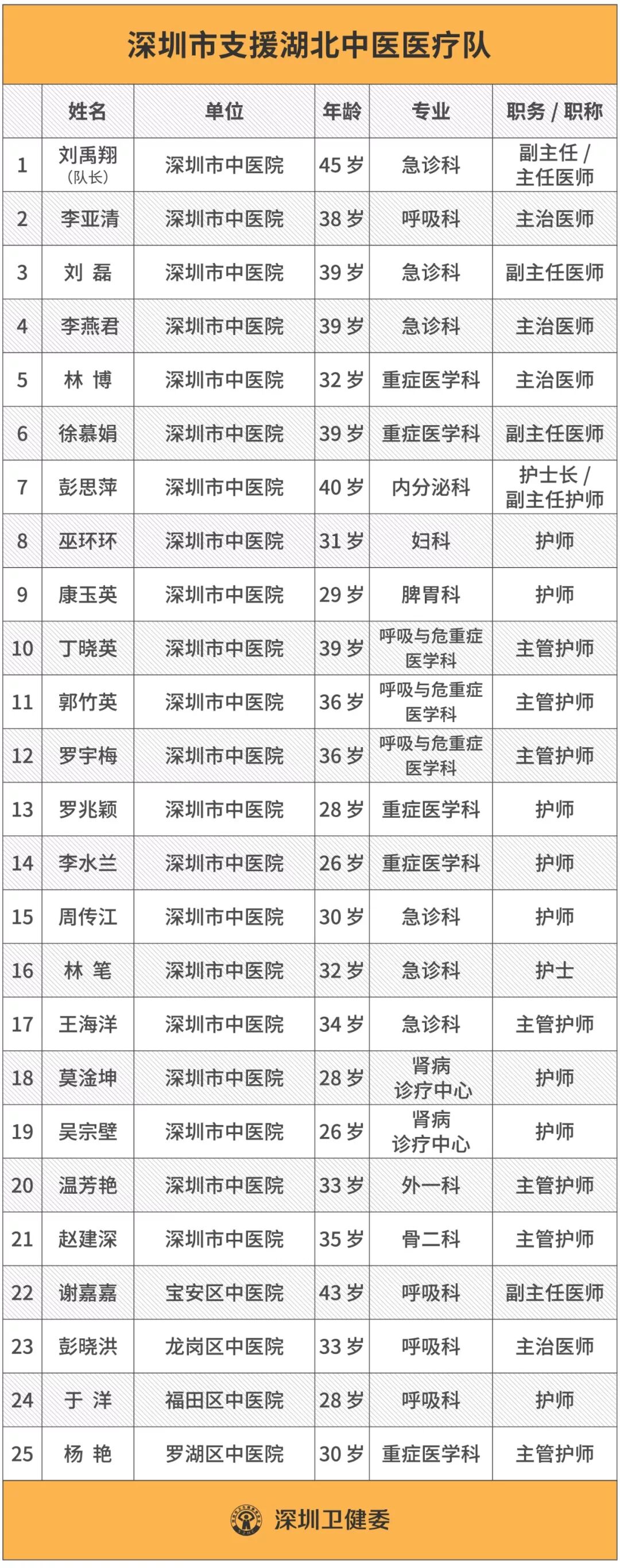 25名队员中,医生8名,包括主任医师1人,副主任医师3人,主治医师4名;护士17名,包括副主任护师1名,主管护师7名,护师8名,护士1名。在人员组成上,21人来自市中医院,4人来自各区中医院,男性12人,女性13人,年龄最大为45岁,最小为26岁,涵盖急诊科、呼吸科、重症医学科和护理学等专业。