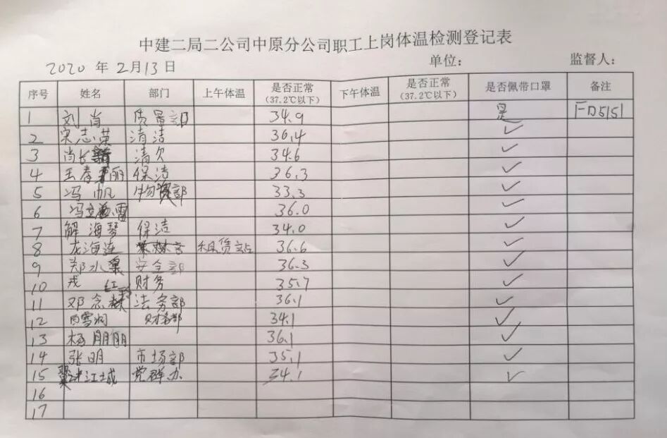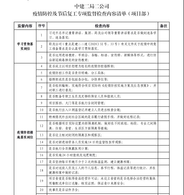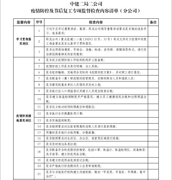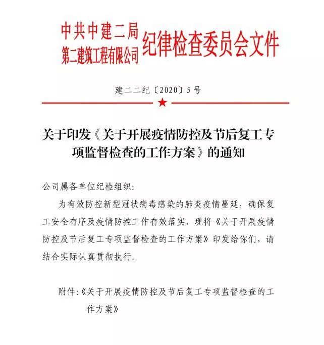 中建二局二公司纪委统筹安排,在前期做好疫情防控监督工作的基础上,下发疫情防控及节后复工监督检查工作方案,并形成详细清单,防控复工监督“两手抓”,坚决打赢防疫阻击战。