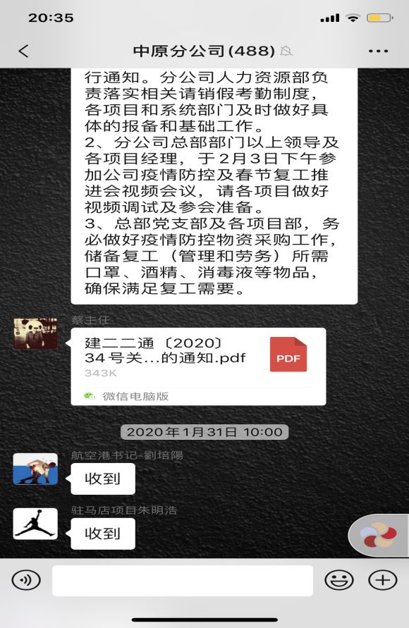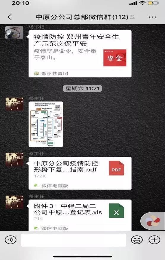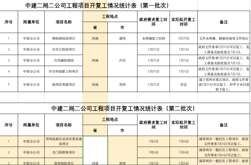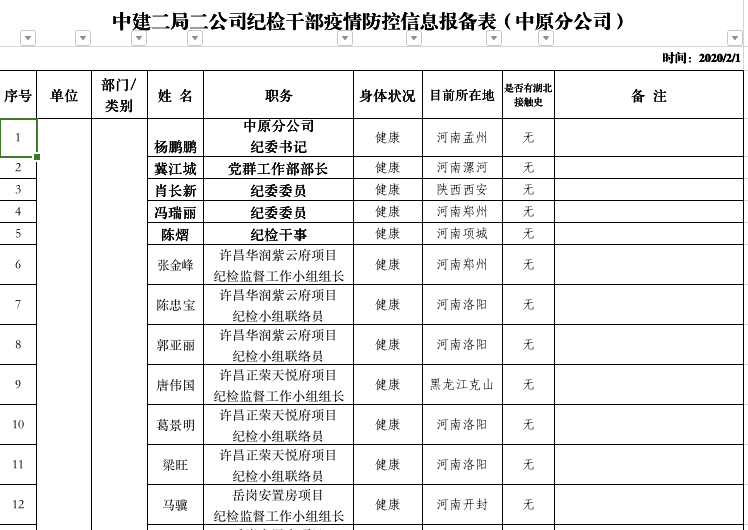 各分公司认真做好信息报送工作,在“疫情防控督导工作小组”的督促下,严格对全体职工身体健康情况及各项目开复工时间进行摸排统计,及时更新员工健康情况,特别是对湖北籍职工,时时掌握其动态。