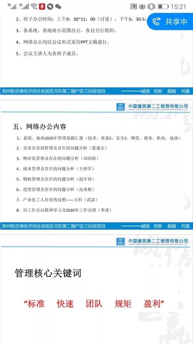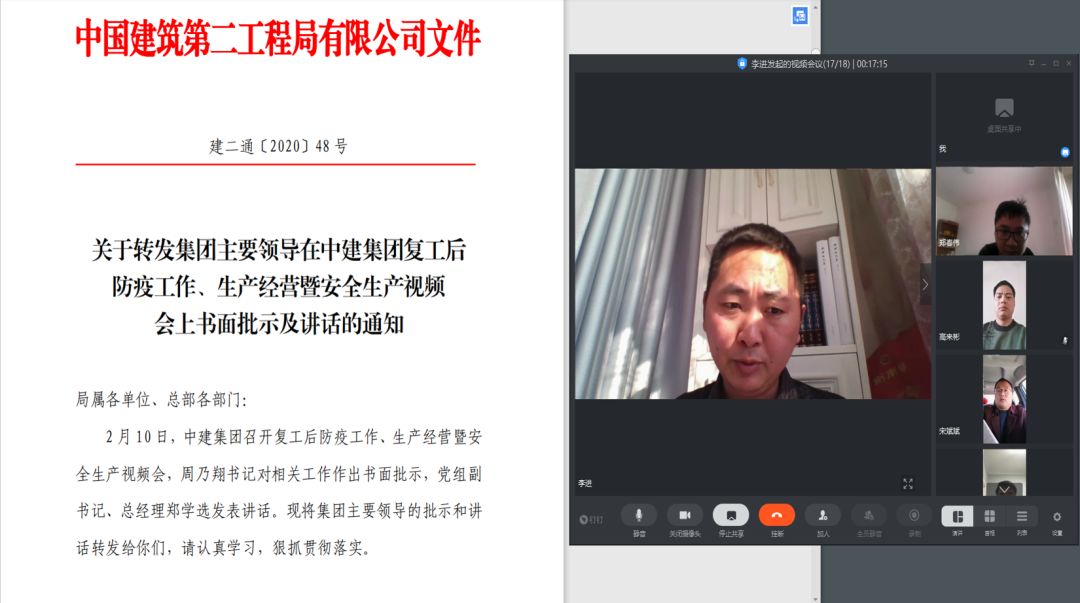 疫情当前,在做好防控工作的同时,项目部一手打好防控战,一手为做好复工备战。项目部提出了网络办公的思路,通过“面对面”对话、“空对空”对接、“PPT讲解”,达到工作不放松、目标有落实。