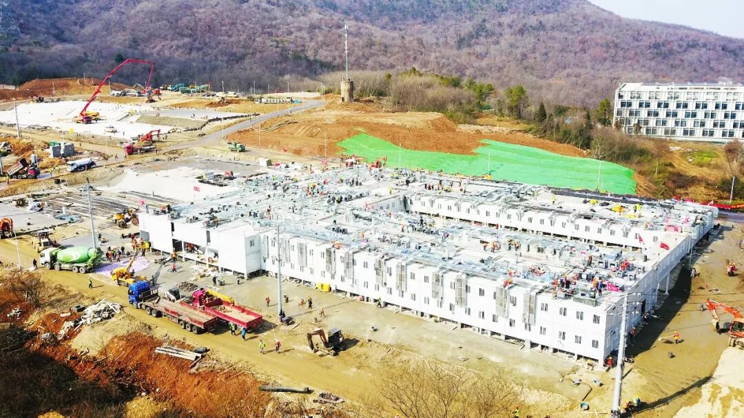 2月11日,集装箱板房钢结构基础加工完成60%;累计进场集成式箱式房154个,目前所有框架已拼接完成。