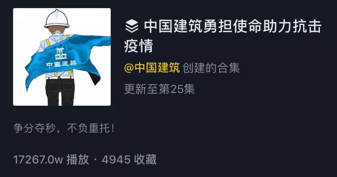 中建集团官方抖音平台上线#中国建筑勇担使命助力抗击疫情#合集,播出25期,总播放1.72亿次,点赞量373.8万。