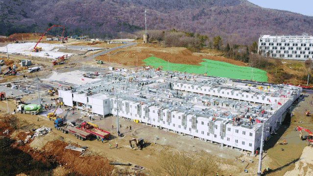 396间板房全部吊装完毕,二期区域进行混凝土浇筑,沥青道路铺设正在进行时。