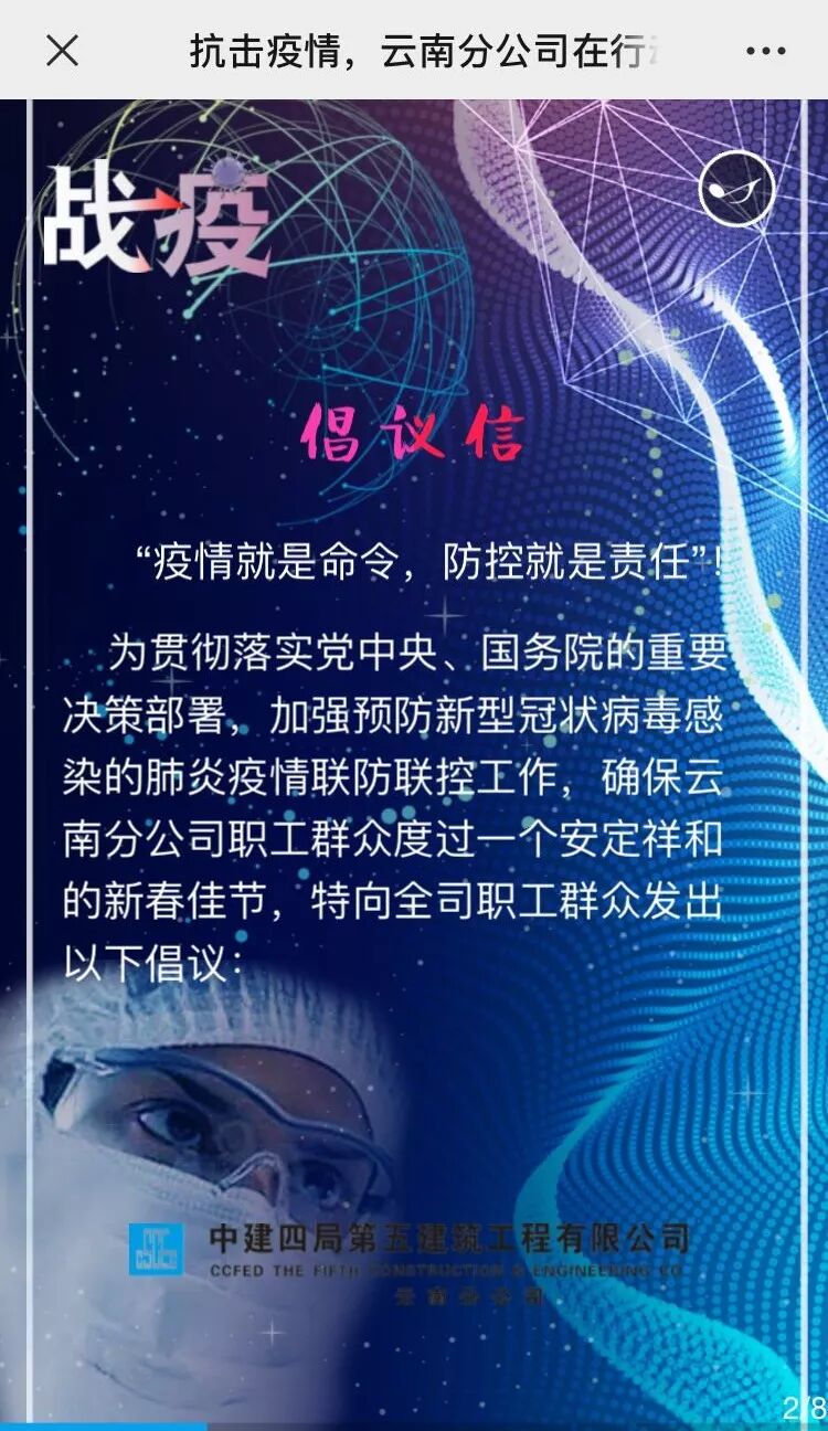 “疫情就是命令,防控就是责任”。各分公司精心制作了疫情防控专题H5,对全体员工进行疫情联防联控倡议,加强防疫工作,确保有效、持续开展疫情防预,阻断疫情传播。