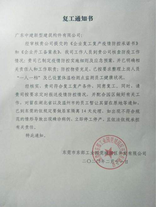 广东中建新型建筑构件有限公司开始恢复生产