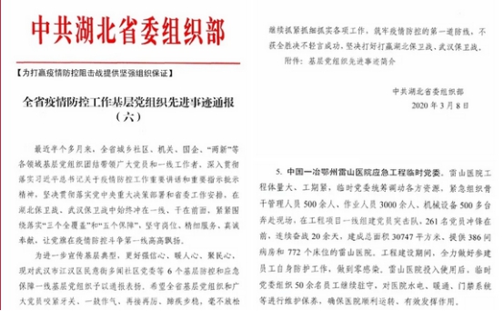 3月8日,为进一步宣传基层典型,更好强信心,暖人心,聚民心,激励全省基层党组织和广大党员继续抓紧抓细抓实各项工作,筑牢疫情防控的第一道防线,湖北省委组织部印发《全省疫情防控工作基层党组织先进事迹通报(六)》,对中国一冶鄂州雷山医院应急工程临时党委等6个基层防控和应急保障一线基层党组织予以通报表扬。